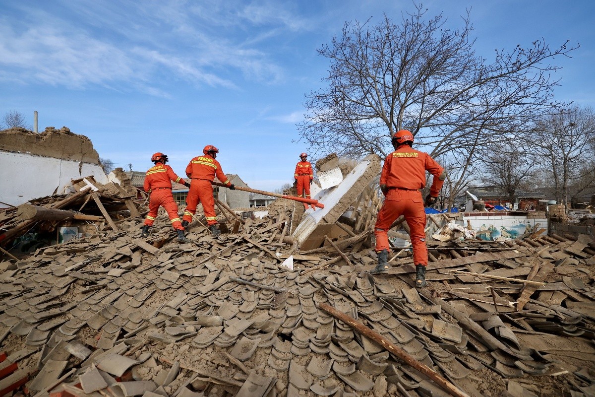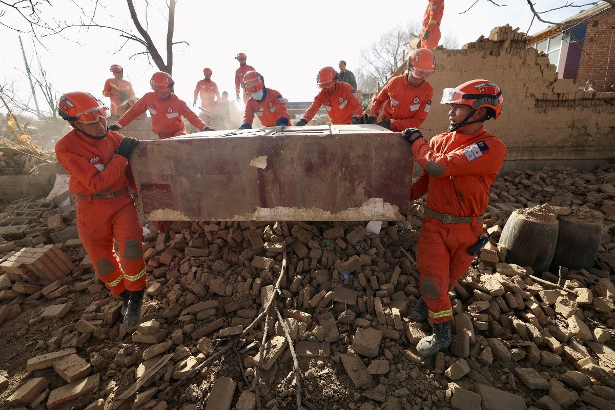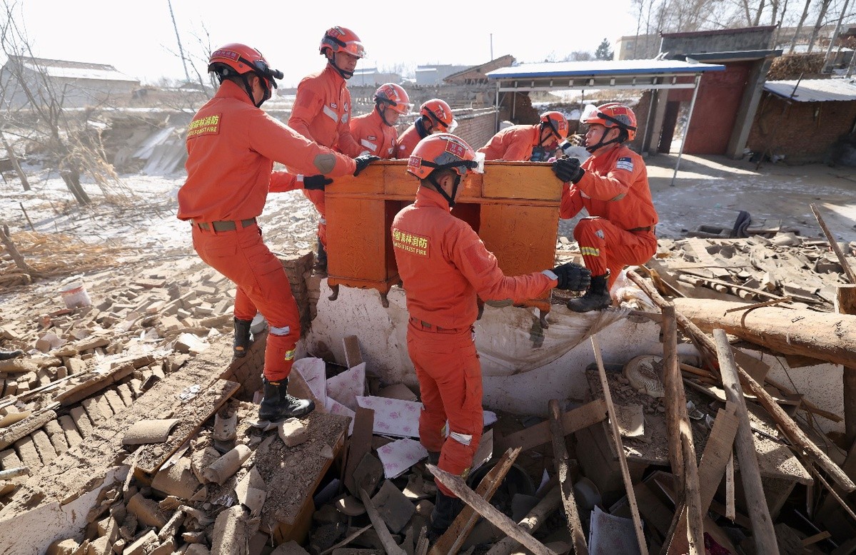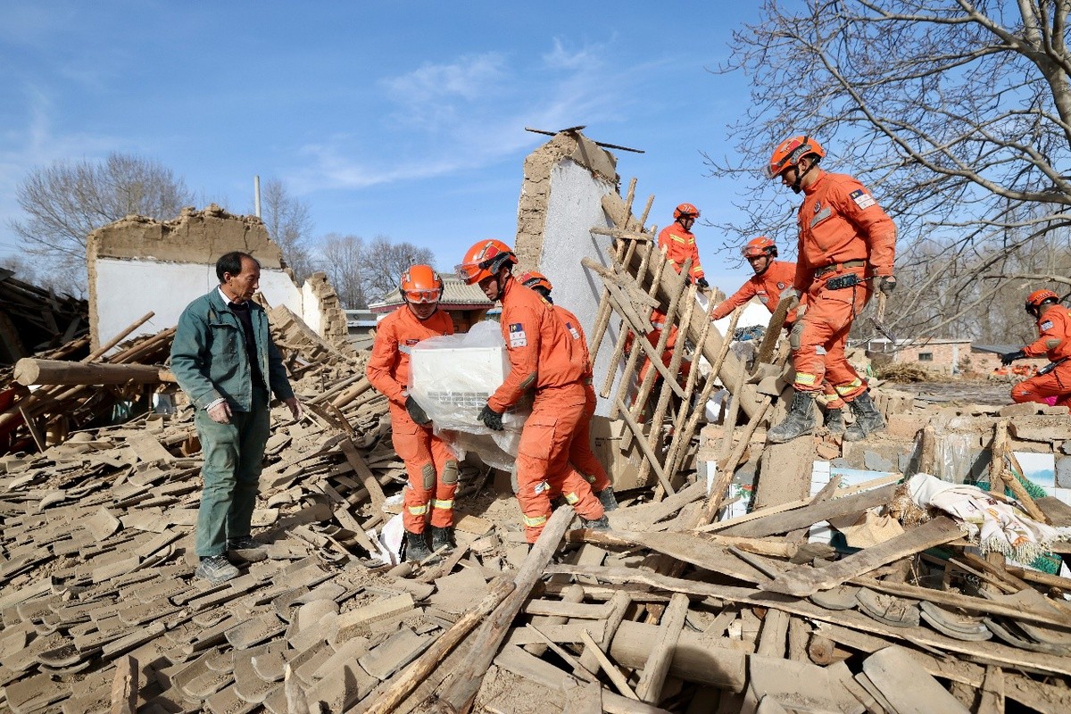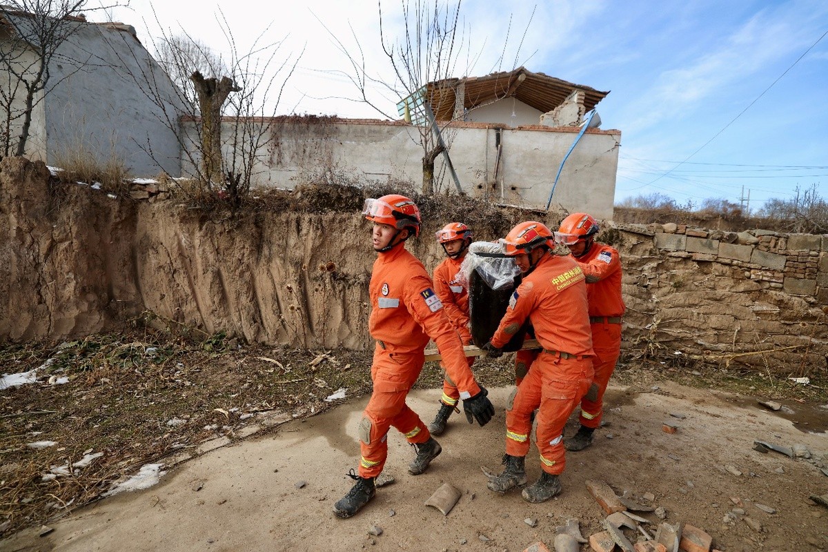 12月20日,在甘肃临夏积石山县石塬镇石塬村,甘肃省森林消防总队合作大队的指战员们在村民家中抢救物资。中国日报记者 魏晓昊 摄