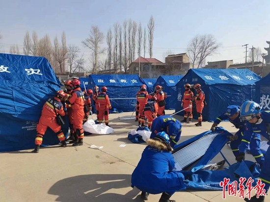 12月19日,甘肃临夏州积石山县大河家镇,消防人员和蓝天救援队正在为受灾群众搭建帐篷。中青报·中青网记者 马富春/摄 本报甘肃积石山12月19日电(中青报·中青网记者 马富春)12月18日23时59分,甘肃省临夏州积石山县发生6.2级地震,地震造成当地群众生命财产重大损失。地震发生后,甘肃各界立即启动应急响应,全面投入抗震救灾,一场可歌可泣的救援行动在积石山灾区全面展开。 地震发生后,甘肃省森林消防总队400人立即集结,携带装备、物资赶赴震中连夜开展人员搜救、物资保障工作。19日凌晨5时,甘肃森林消防救援人员第一时间挺进积石山县石塬镇秦阴村,地震导致该村大面积房屋受损,救援人员深入农户家中,发放大衣50余件,搭设帐篷30余顶,累计救助群众200余人,救出掩埋牲畜40余头。积石山县大河家镇房屋多为自建房,墙体有明显裂缝,部分墙体垮塌。甘肃森林消防总队特勤大队采取人工和犬搜索相结合的方式,开展人员搜救,排查安全隐患。 地震发生后,承担积石山县乡村振兴项目建设的中铁二十一局积石山县大河家项目部第一时间组织所属人员撤离至安全地带,并提供10台车辆帮助驻地周围群众做好防寒保暖。19日凌晨1时30分,中铁二十一局积石山县大河家项目部接到积石山县住建局通知,火速集结28名党员干部职工,调遣救援指挥车6辆、大型机械4台,组成抗震救灾先遣队,赶往受灾较为严重的刘集乡团结村、阳洼村、康调村,协助当地应急救援队伍疏通道路、拆除危墙、转移村民。截至目前,已抢通道路9条,后续救援工作仍在紧张进行。 党有号召,团有行动。地震发生后,团甘肃省委迅速启动应急响应机制,成立工作领导小组,发出倡议书,招募青年志愿者开展物资搬运、秩序维护、心理疏导等服务,由团甘肃省委书记董安宁带领直属救援队甘肃蓝天救援队第一时间赶赴震区。 甘肃蓝天救援队集结救援队员32人,出动车辆10辆,携地震救援装备85件套、消毒剂等医疗救援装备第一时间赶往积石山县参与救援。另有4支备勤应急救援队200余人,全力准备出发参与救灾。 为支持和帮助临夏州各级团组织有序参与抗震救灾工作,团甘肃省委决定,紧急下拨30万元专项团费,用于临夏州各级团组织开展抗震救灾工作。团甘肃省委要求,各级团组织和广大团员青年要切实把思想和行动统一到习近平总书记重要指示上来,充分发挥广大团员和基层团组织在抗震救灾工作中的生力军和突击队作用,切实加强专项团费的管理监督,把资金用在最紧迫最需要的地方,做到专款专用,确保专项团费在抗震救灾工作中发挥传递组织温暖、解决实际困难、凝聚团员青年的重要作用,用实际行动检验团员和青年主题教育成效。 团甘肃省委还紧急动员各方力量向灾区调拨救援物资。截至12月19日12时,甘肃省青基会筹措价值50万元的帐篷、棉衣、棉被等应急物资送达灾区一线。全省各级团组织充分动员社会力量筹措超2000万元的救援物资,目前正分批运往灾区。 地震发生后,甘肃教育部门也立即作出应急响应。甘肃省教育厅工作组第一时间到达积石山县实地了解当地学校师生避险、安全转移及校舍受损情况,现场指导当地教育系统开展抗震救灾。临夏州已组织专门力量对辖区学校进行全面摸排,经查,在校寄宿学生无伤亡。 为确保2024年硕士研究生考试工作顺利进行,教育部门第一时间摸排临夏考点,了解监考教师和考务人员及家属是否遇到困难。同时,成立专班对积石山籍参加考试的1240名考生一一对应联系,确保如期参加考试。 为帮助因地震受灾致困学生渡过难关,兰州大学快速启动受灾学生摸排工作,开通“甘肃临夏州积石山县地震受灾学生临时困难补助”专项通道,受地震影响导致家庭经济出现困难的在读本科生即日起可进行受灾专项资助申请,经审核后将参照学生临时困难补助标准确认并发放补助金。 地震发生后,兰州大学第二医院第一时间启动响应机制,12月19日凌晨,第一批医疗队抵达临夏州人民医院开展医疗救治工作。在该院神经外科医师指导下,当地医院已顺利为一名13岁有重度颅脑损伤、脑疝的患者完成颅内血肿清除术+去骨瓣减压术,目前患者正在重症医学科接受后续治疗。当天,该院医疗队员还成功为一例重物砸伤患者完成腰椎骨折切开复位内固定+椎板切除减压手术。 19日上午,由21名专家组成的甘肃省中医院首批医疗救援队包含普通外科、心胸外科、神经外科、泌尿外科、创伤骨科、脊柱骨科、手外科、急诊、重症、麻醉、院感等科室专业医护人员,携带“甘肃方剂”、院内制剂“损伤胶囊”等常用药品、创伤药品及医用耗材等赶往灾区。当天下午,该医疗救援队在临夏州中医医院对转至该院治疗的30多名伤者进行查房会诊和病例讨论,发挥中医药特色开展医疗救治工作,有针对性地提出治疗指导意见。 来源:中国青年报