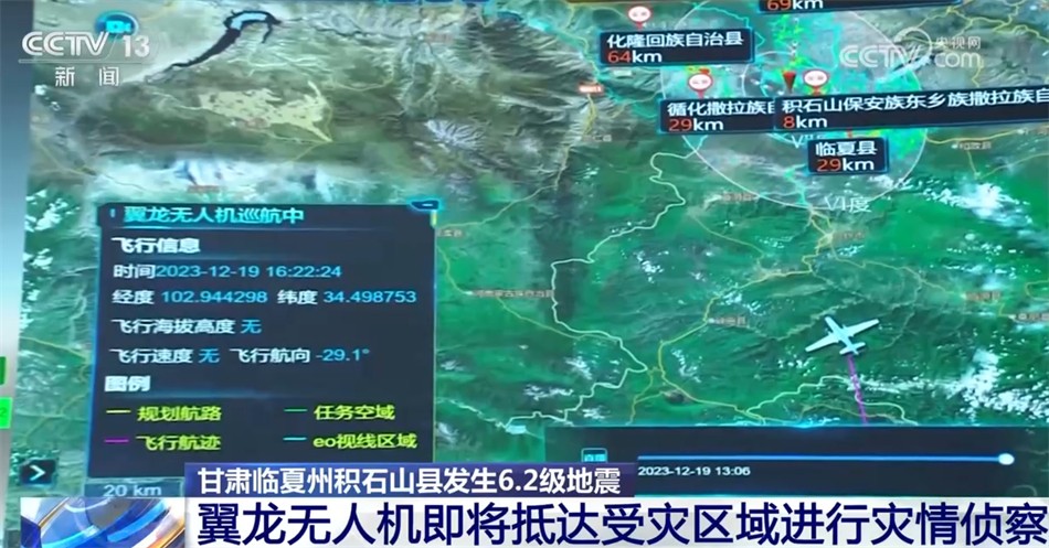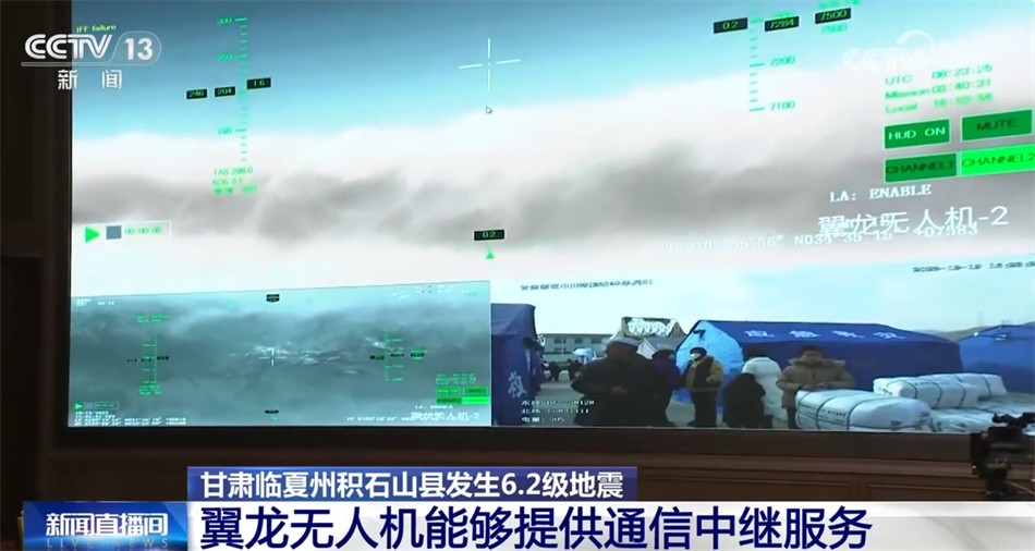 从大屏幕上我们还能看到,有一架飞机正在赶往震中区域。这就是今天中午12时左右从四川自贡起飞的翼龙无人机。在翼龙无人机抵达受灾区域后,将在灾区进行巡航,进行实时的空中灾情侦察,即时回传灾情画面,对救援指挥的决策提供辅助作用。