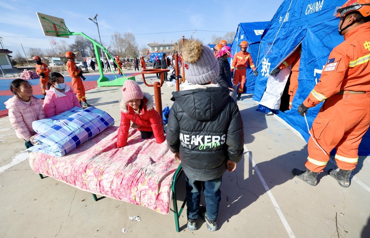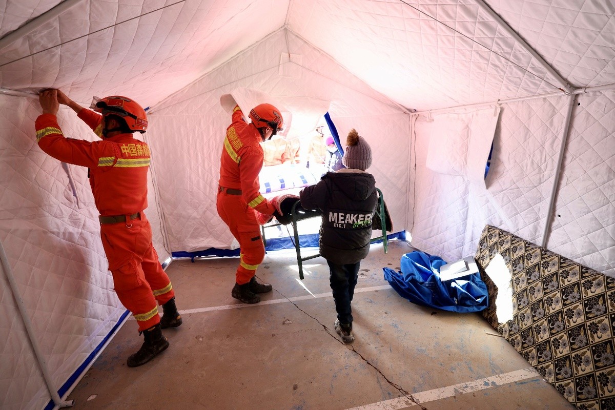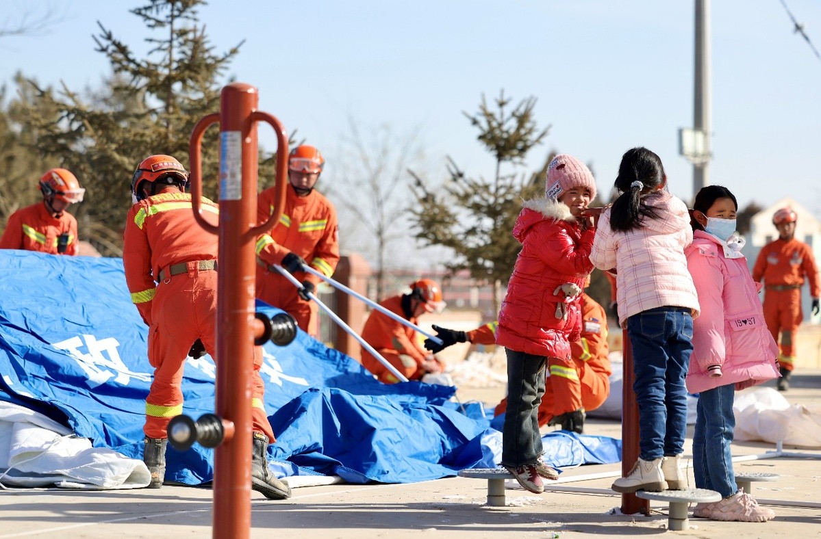 中国日报12月20日电(记者 魏晓昊)2023年12月20日,甘肃临夏积石山县石塬镇石塬村,甘肃省森林消防总队合作大队的指战员们搭建救灾帐篷。 12月18日23时59分,甘肃临夏州积石山县发生6.2级地震。目前,救灾及临时安置工作正在有序开展。