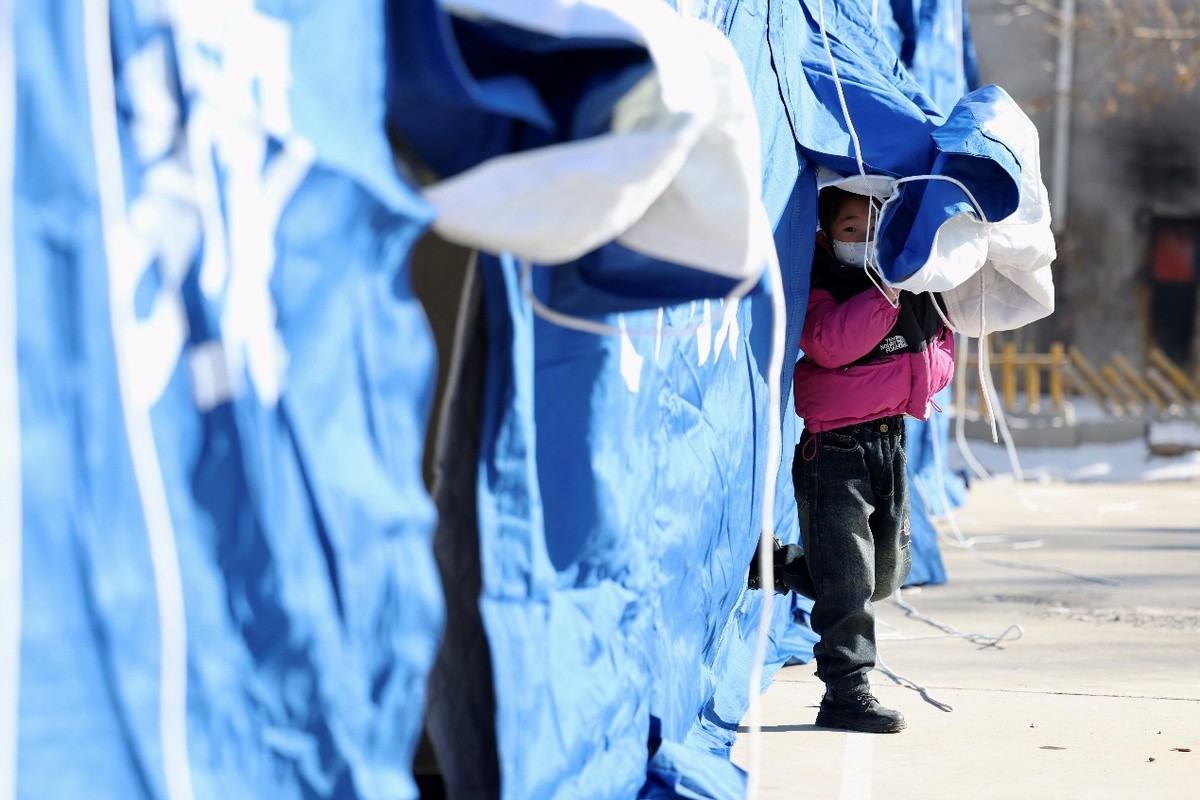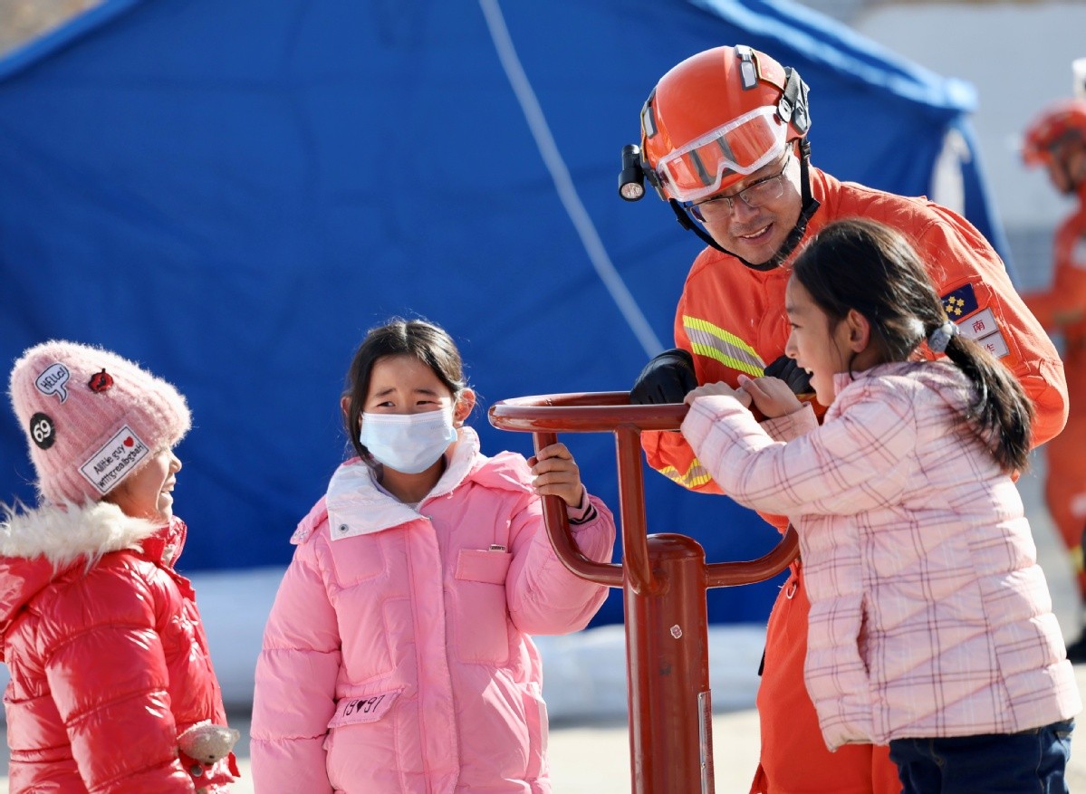 12月20日,甘肃临夏积石山县石塬镇石塬村一安置点,小朋友在玩耍。中国日报记者 魏晓昊 摄