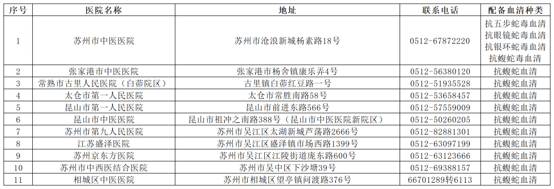 目前,苏州共有 11家医疗机构可救治蛇咬伤 包括11个急诊 2个专科门诊 具体名单如下