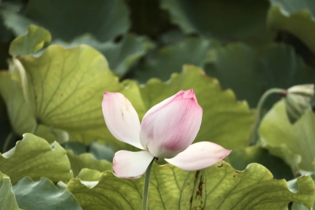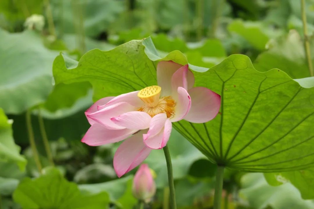 大片荷叶紧密相依,如伞盖般遮蔽湖面。其间点缀着的荷花,有的含苞待放,有的娇艳盛开,展现园林温婉的美。