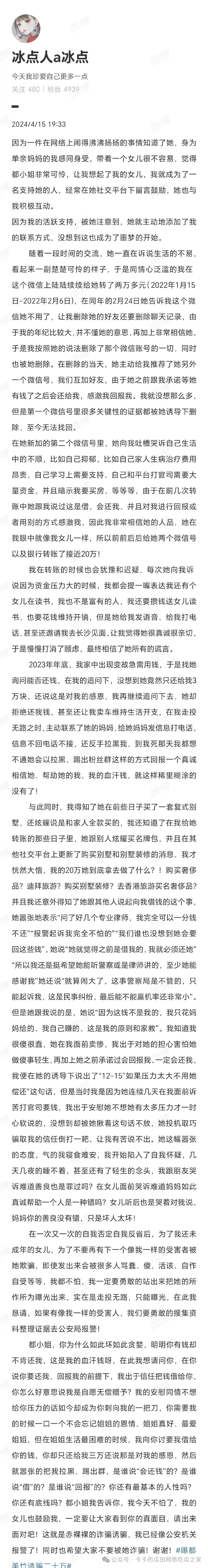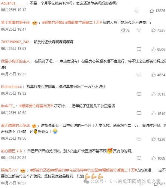 此前,朱女士发文称,2022-2023年期间,都美竹以“患抑郁症”“打官司需要大量资金”“家人生病治疗费昂贵”等理由向其索要钱财,她累计转账近20万元。朱女士称都美竹承诺还款,但后续仅归还3万元后将其拉黑、踢出粉丝群。反正冰姐现在已经报了案做完笔录,那就等一个官方通报吧(如果有),还是以官方的调查为准。