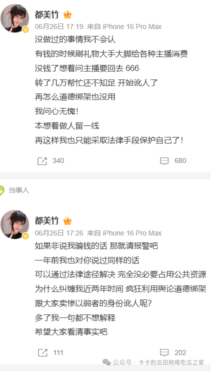 尊敬的各位网友:我是被都美竹诱骗将近二十万的当事人冰姐(朱女士),我于2025年6月24日与我接近80岁的老父亲跨越2900公里历时38个小时于6月24日凌晨5:00到达乌兰浩特市维权,维权后我立马尝试用微信联系都美竹,都美竹不接微信语音电话,并且她立马拒收我的微信消息并拉黑。 请问都美竹,你是不敢面对我吗?在此,我再一次恳请如有被她骗的人联系我,我们一起共同发声!有愿意帮助我的记者朋友们吗?我愿意接受采访!请求各位网友帮忙转发并且扩散,谢谢!